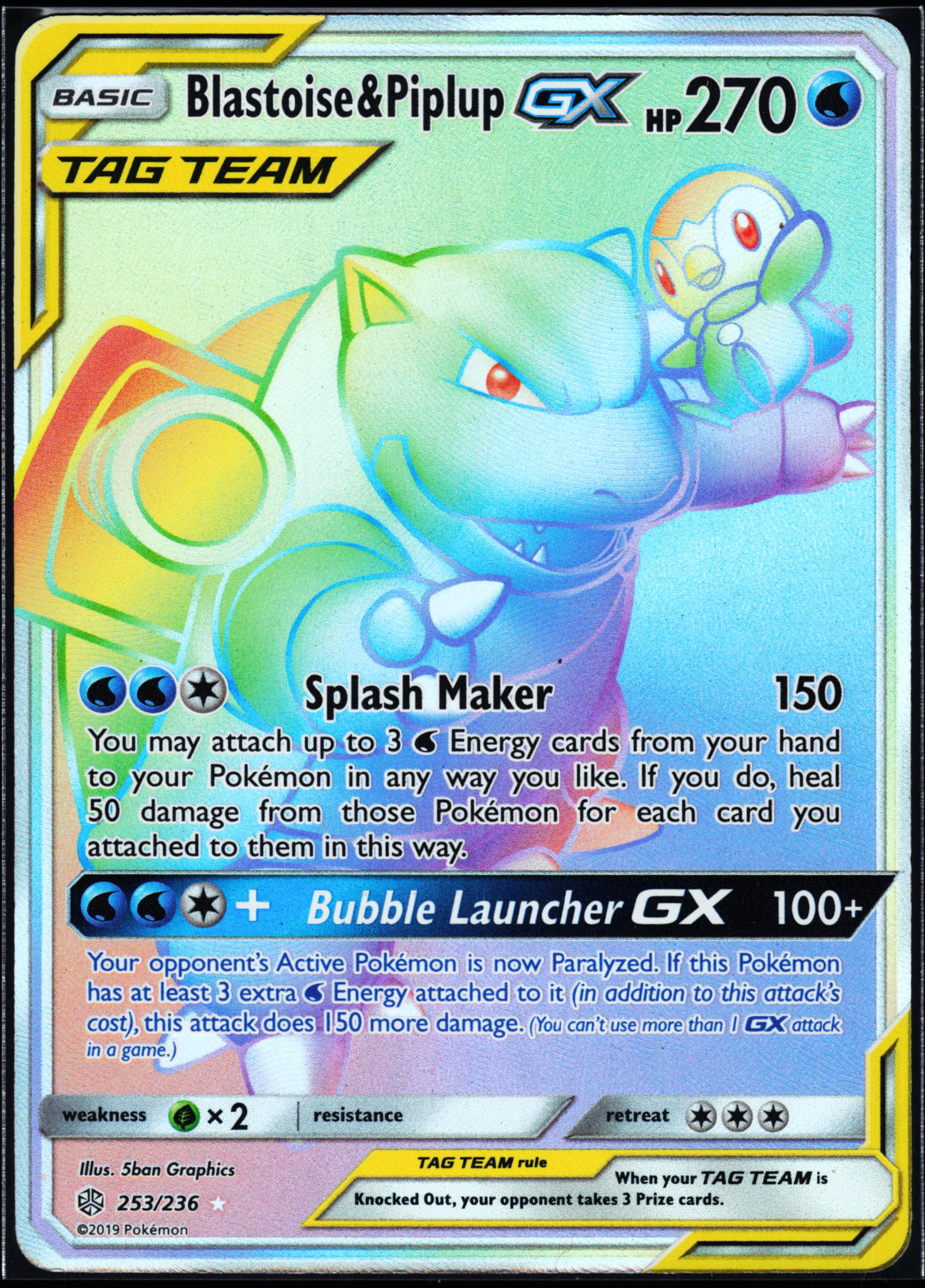 This is a nice example of a SM - Cosmic Eclipse #253/236 Blastoise & Piplup GX (Secret) Other important information about this card:Secret RareIn 2019 Blastoise & Piplup GX (Secret) played for the .Please check out our other listings for more great cards.