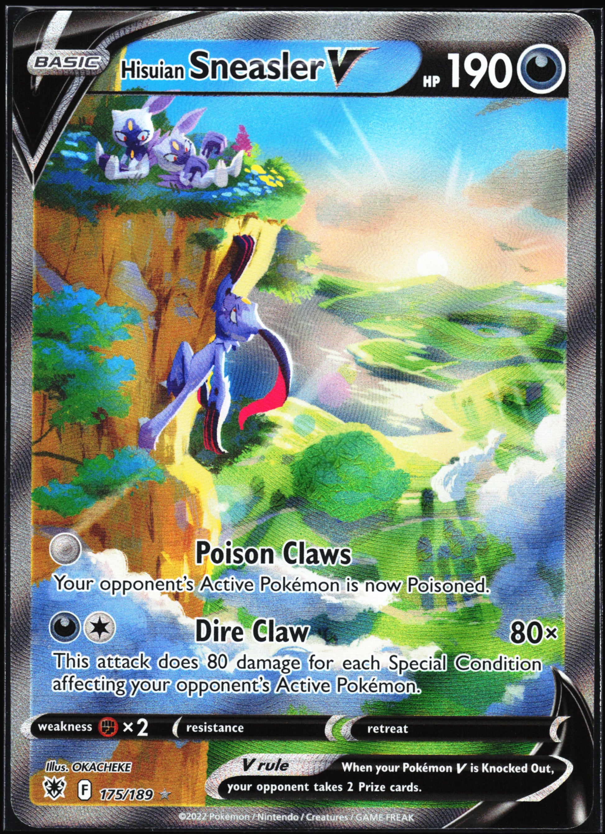 This is a nice example of a SWSH10: Astral Radiance #175/189 Hisuian Sneasler V (Alternate Full Art) Other important information about this card:Ultra RareIn 2022 Hisuian Sneasler V (Alternate Full Art) played for the .Please check out our other listings for more great cards.